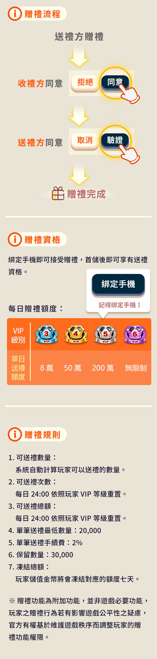 - 綁定門號升級為VIP2,開通接受贈禮的功能。