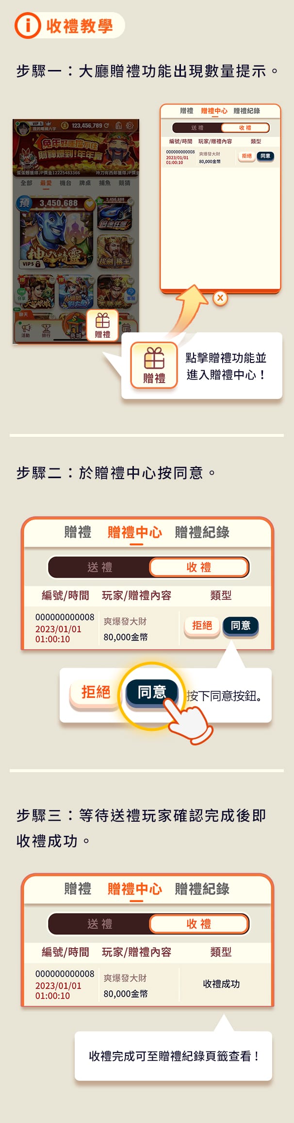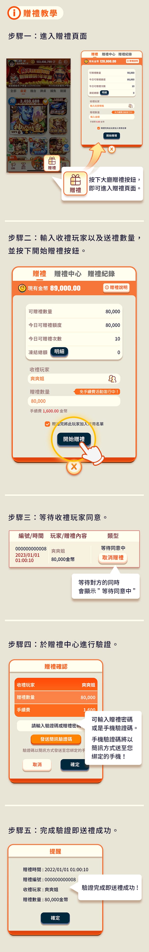- 贈禮:此功能需要進行首次儲值及手機綁定才可開啟贈禮資格,詳細操作說明可點擊【ⓘ贈禮說明】,您可以將爽爆金幣送給其他好友